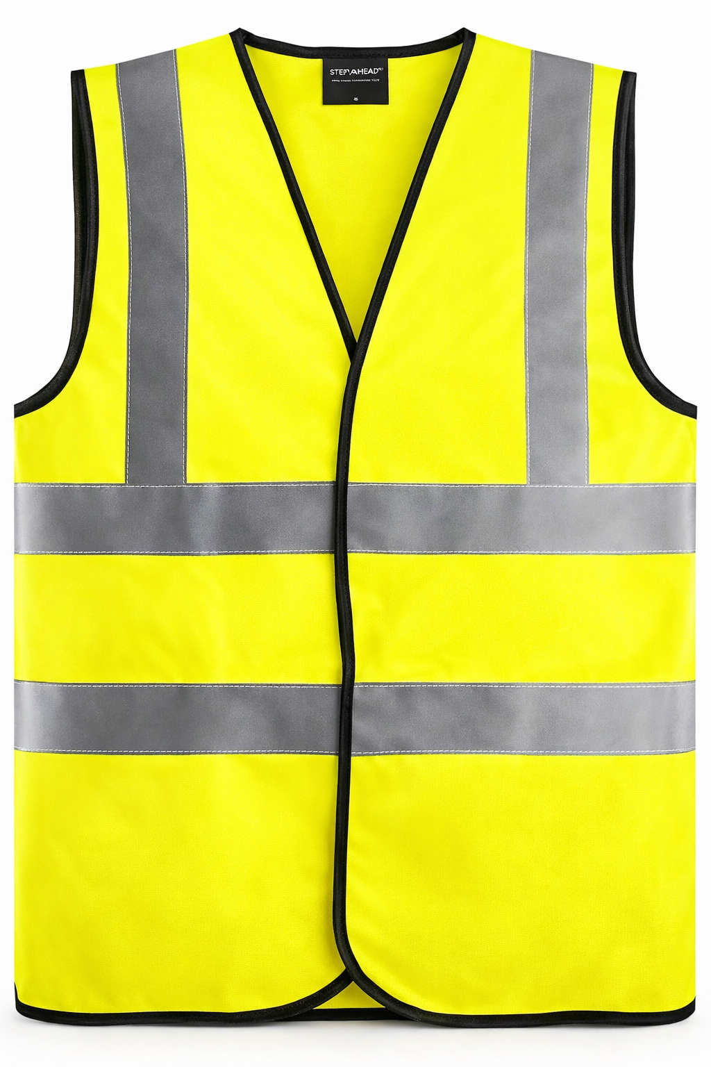 Complying with CE EN471 safety standards, the vest features double band and brace retro reflective tape, ensuring excellent visibility in daylight, low light, and poor weather conditions. The fluorescent polyester fabric combined with black bias binding edge trim offers durability and a professional appearance.