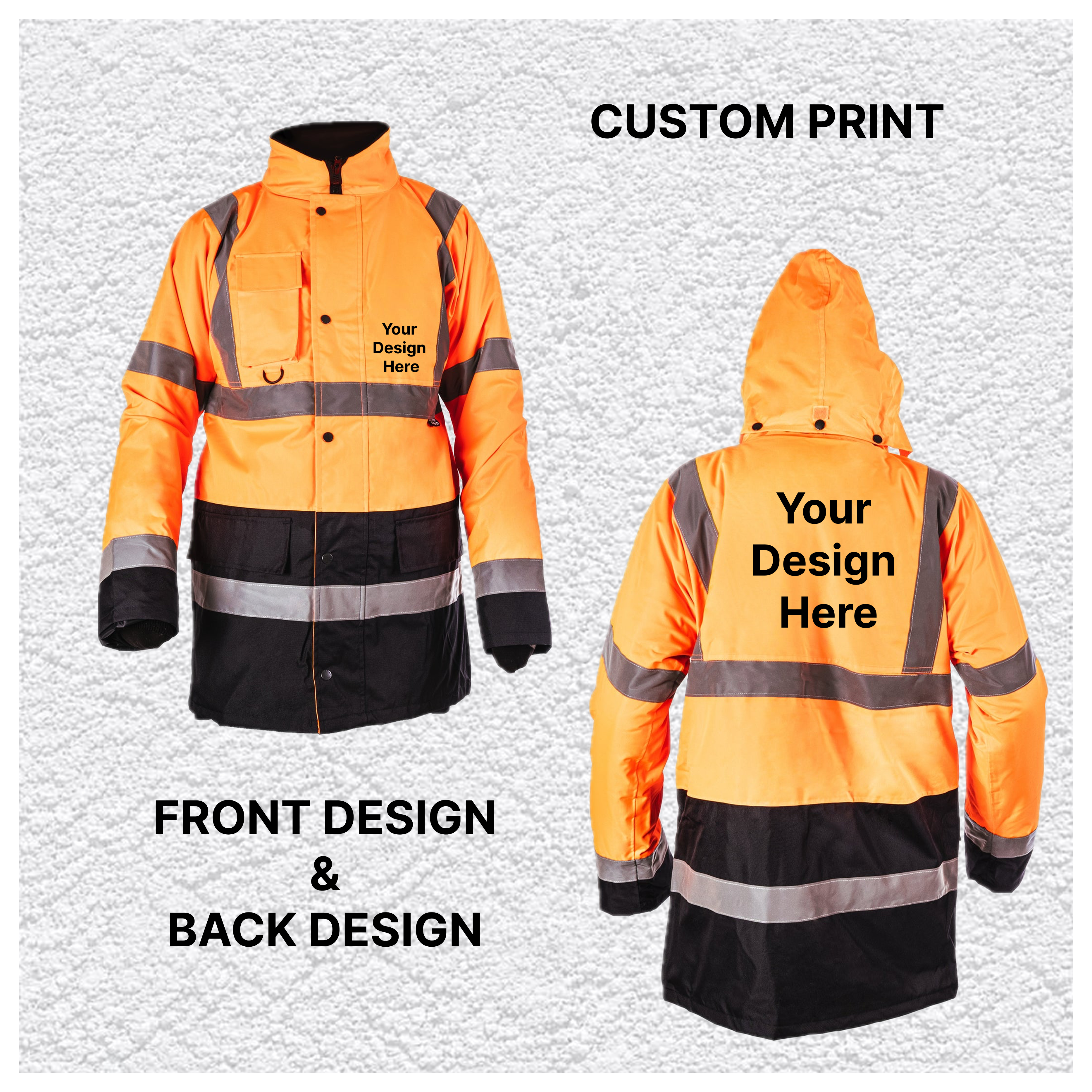 Our Custom Print Hi-Vis Two Tone Parka Jacket delivers outstanding protection in harsh outdoor environments while offering professional custom branding on the front and back. Designed for high-visibility roles, this jacket combines durability, comfort, and compliance with key safety standards.