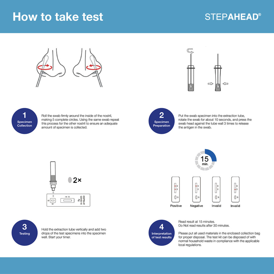 Press the hole and place the extraction tube into the hole. Add 2 drops of the test specimens into the test device's specimen well (S). Interpret the results at 15 minutes. The result obtained after 30 minutes is invalid. For In Vitro Diagnostic Use Only